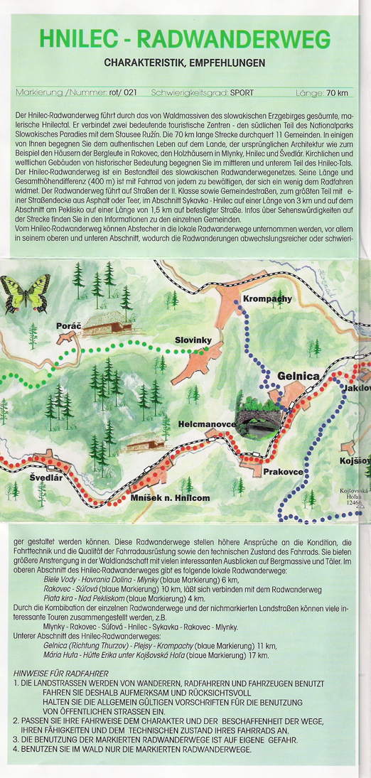 Hnilecká cyklomagistrála prechádza malebnou Hnileckou dolinou, lemovanou lesnými masívmi Slovenského rudohoria. Spája dve významné strediská cestovného ruchu - južnú časť Národného parku Slovenský raj s umelou vodnou nádržou Ružín. V 70 km prechádza 11 obcami.
